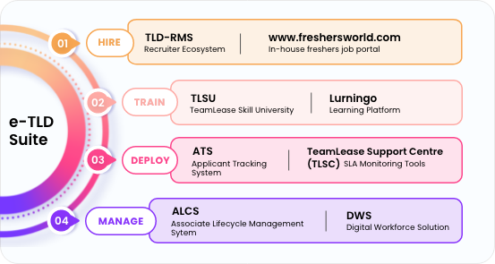 The product suite is a combination of all our platforms which manage the clients and associate lifecycle. TeamLease Digital has one of the best hiring engines in the industry, which is driven by various technology integration at its core. We are well known in industry for our training practices and are equipped with an inhouse built learning platform. Our deployment process is tech enabled and offers one stop solution for our clients. We manage a huge human resource, and entire lifecycle of our associate, from onboarding to exit is managed by our proprietary digital workforce solution